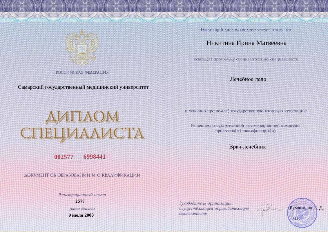 - Самарский государственный медицинский университет: Окончила в 2000 году по специальности "лечебное дело".